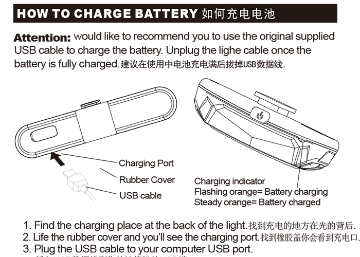 特性:LED技術(shù),COB整面發(fā)光30顆燈珠,高亮100流明設(shè)計(jì);配備USB接口,可循環(huán)充電;六種模式可循環(huán)切換;電池自動(dòng)保護(hù)功能,電壓低于2.8V不工作;硅膠捆扎固定方式,120度方位調(diào)整,方便拆卸安裝;方型背扣設(shè)計(jì),可橫向和縱向不同角度安裝;可安裝在坐管,下叉,車把手,前叉等。
