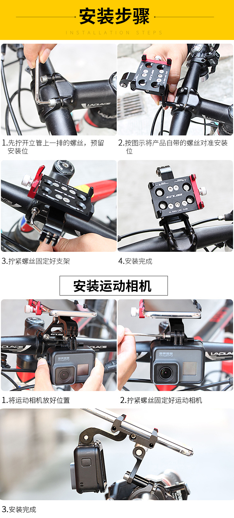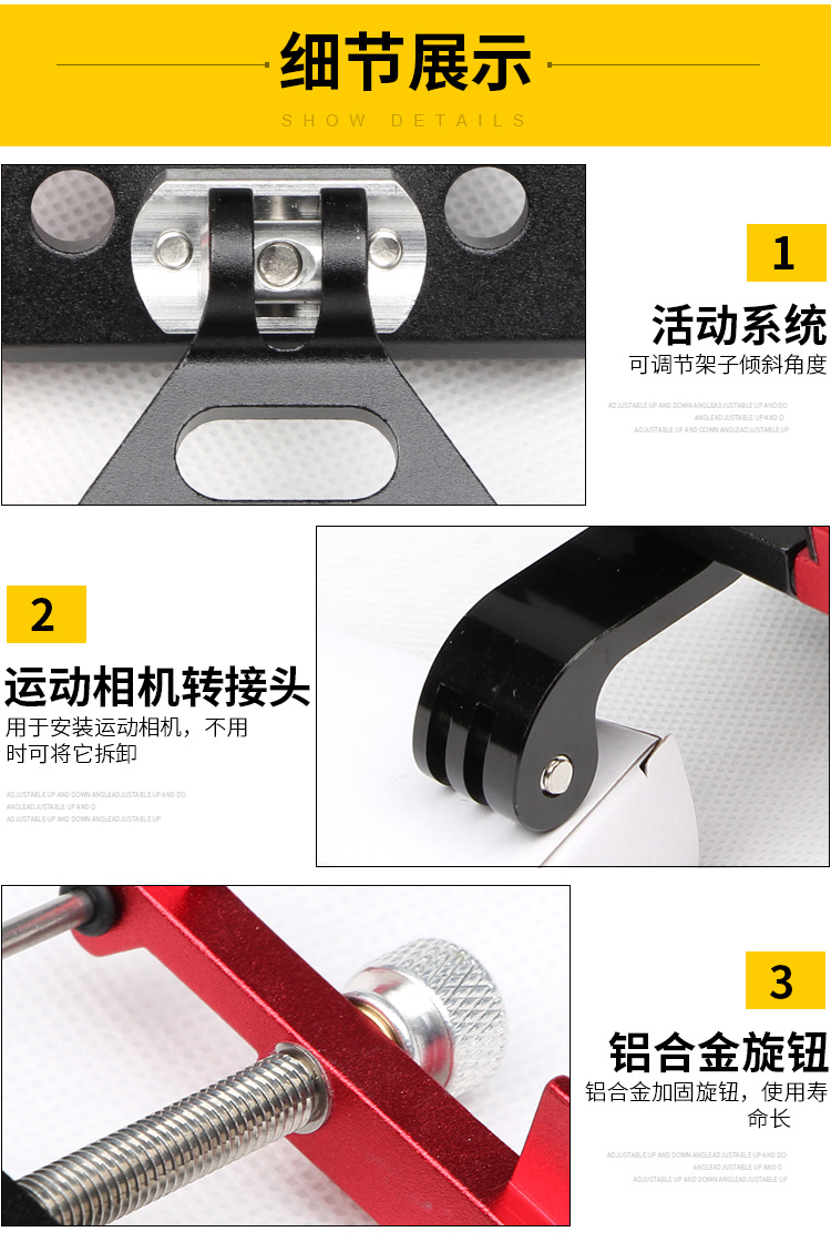 特點:全鋁合金架體,把立式安裝系統(tǒng)(釋放車頭空間,居中安裝強迫癥也能安然接受),可調(diào)節(jié)角度,附帶可拆卸運動相機轉(zhuǎn)接頭。