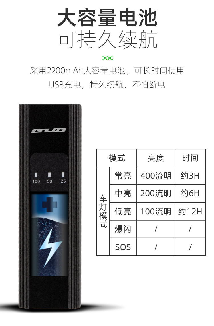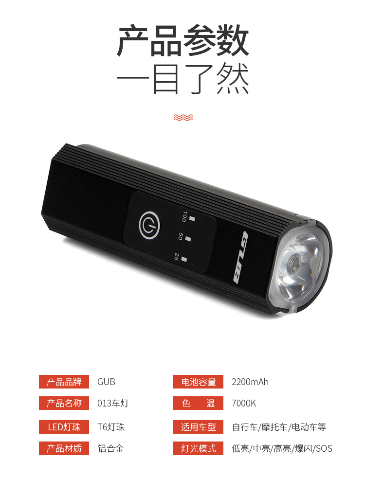 燈光模式:低亮/中亮/高亮/閃亮/SOS