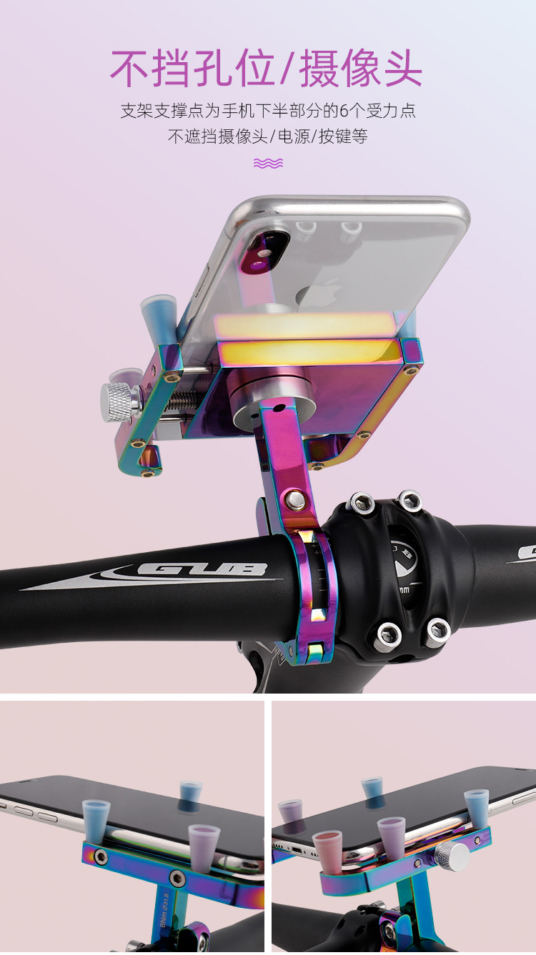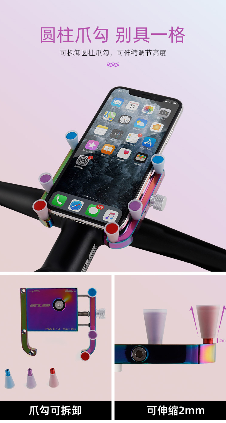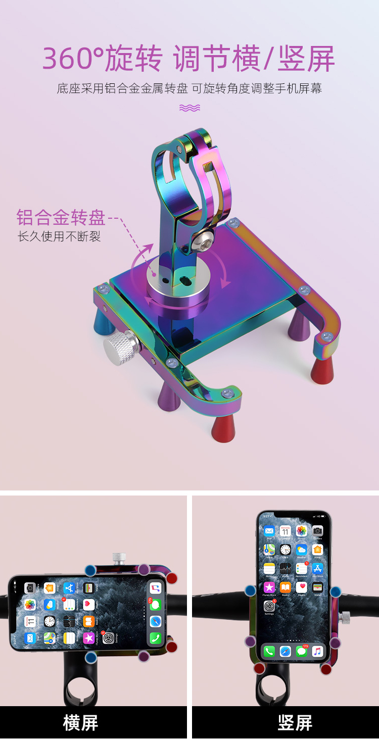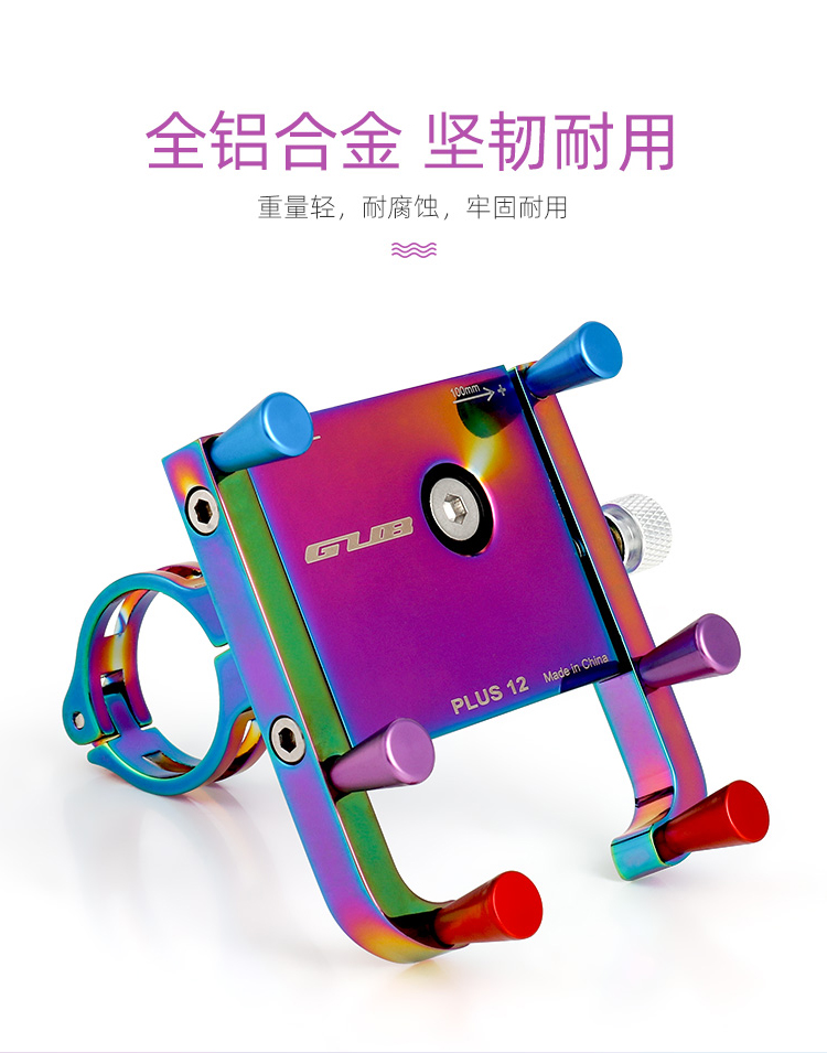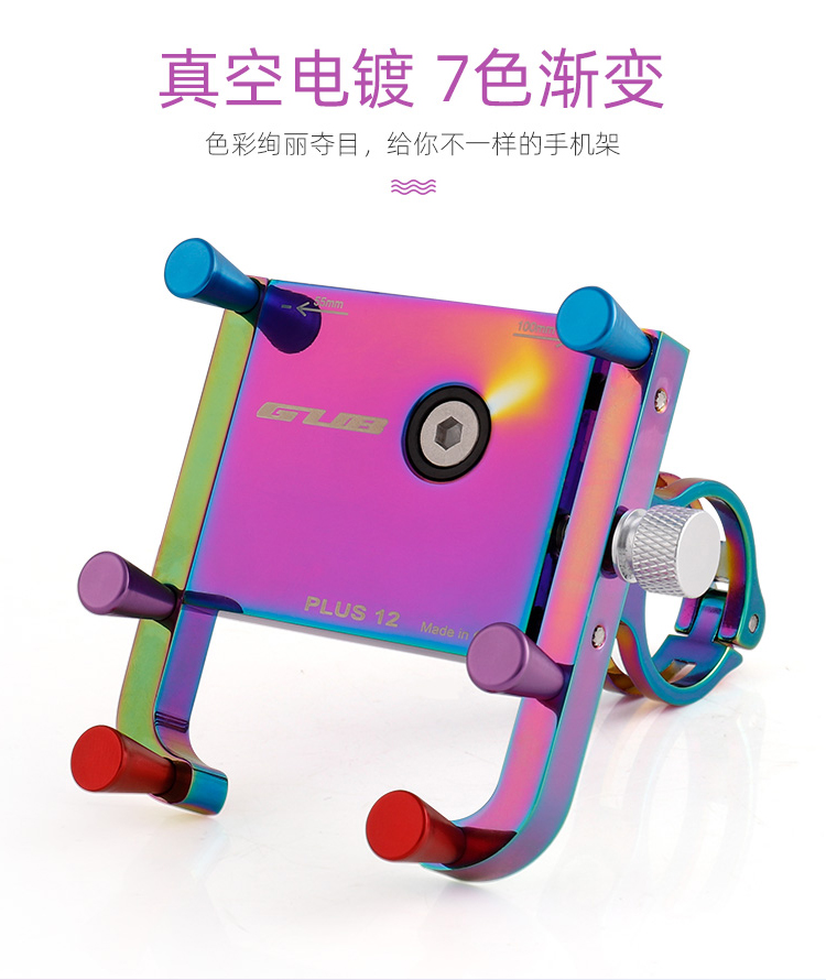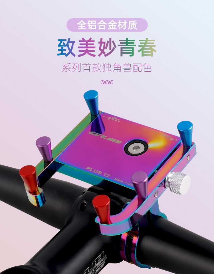 特點:鋁合金架體,表面七彩電鍍工藝,帶來猶如夢幻獨角獸般的觀感,高兼容性不挑手機(jī)型號,自行車、電動車等都可使用!