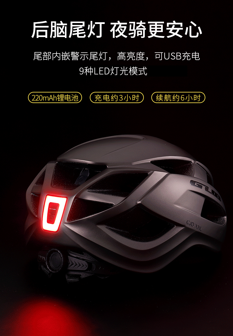 特色:超大頭圍,帶USB充電尾燈(九種模式),一體成型,造型時(shí)尚,多通風(fēng)孔設(shè)計(jì),多色可選。