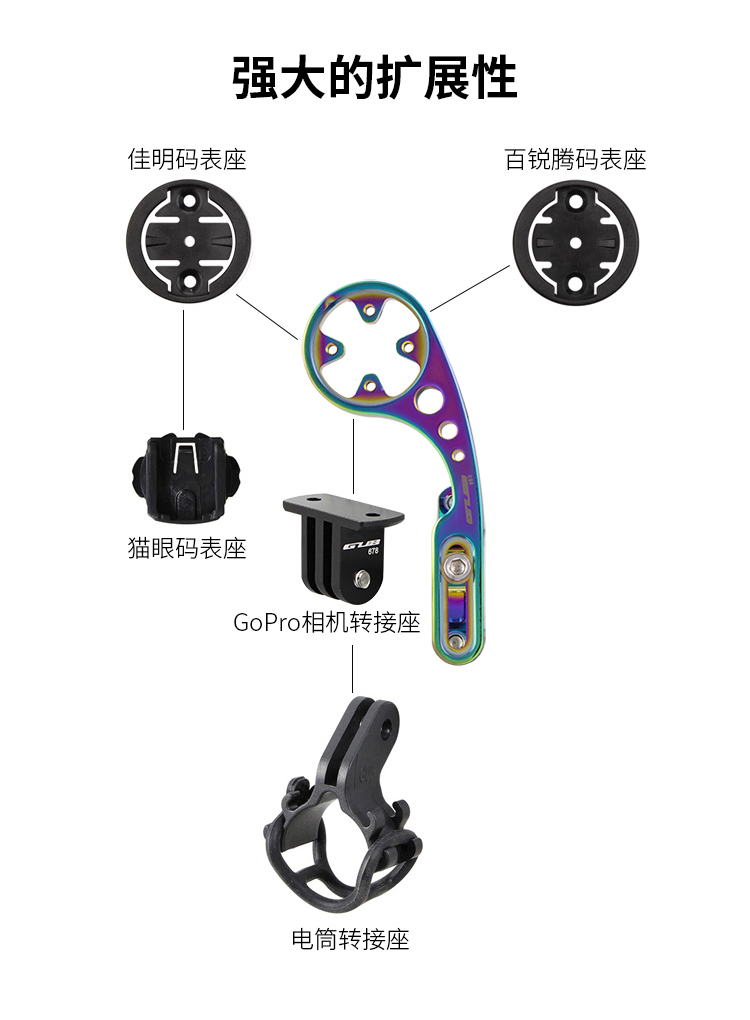 安裝在車把上,可伸縮設計,兼容佳明碼表,使用附帶的配件可兼容百銳騰碼表、貓眼碼表,另標配運動相機轉(zhuǎn)接頭和電筒轉(zhuǎn)接頭。