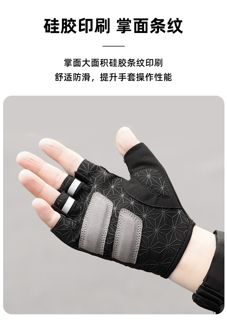 特點(diǎn):簡(jiǎn)約設(shè)計(jì)、貼合手掌,手背高彈透氣面料,手掌大面積硅膠印刷條紋,防滑效果好