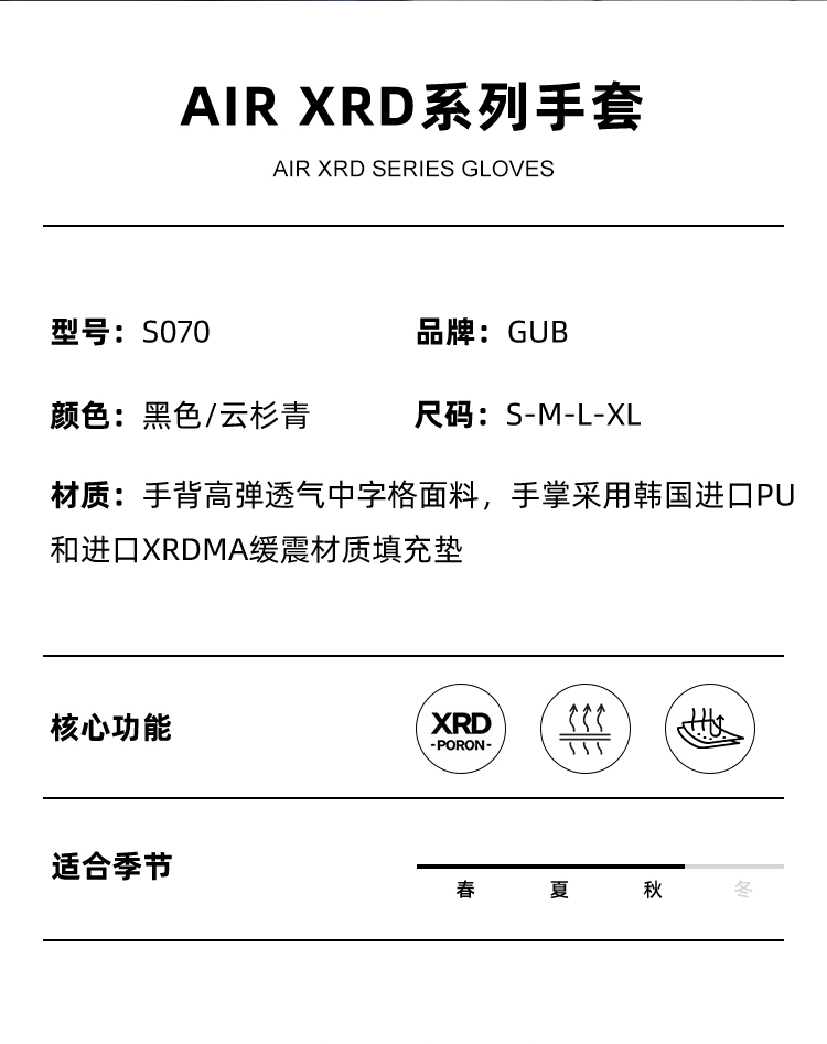 材質(zhì):手背高彈透氣中字格面料,手掌采用韓國進口PU和進口XRDMA緩震材質(zhì)填充墊