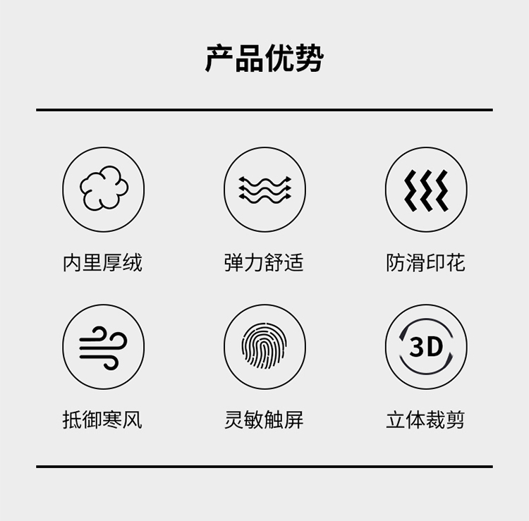 特點(diǎn):內(nèi)里加絨,抵御寒風(fēng),柔軟舒適,3D立體裁剪,防滑耐磨