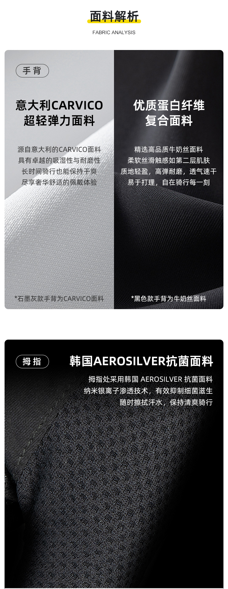 材質(zhì):意大利Carvico(石墨灰)、牛奶絲手背面料(黑色)、3D打印TPU掌墊、進口PORON XRD緩沖掌墊、韓國大孔PU掌面、韓國Aerosilver抗菌面料(擦汗布)
