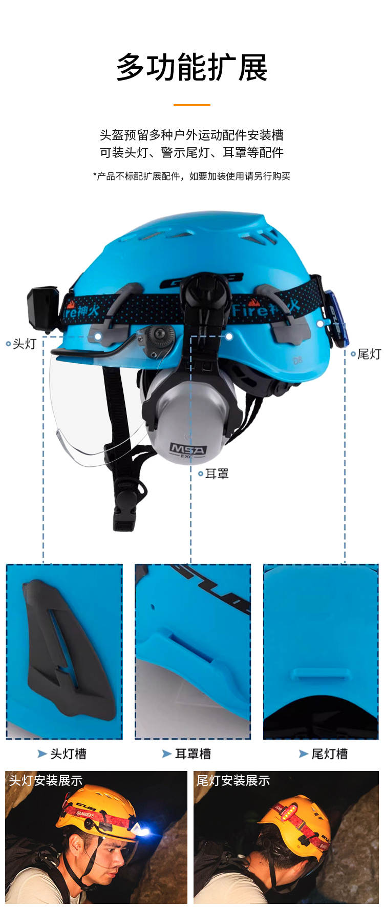 特色:簡約大方的外觀設(shè)計(jì),升級(jí)可拆卸風(fēng)鏡,PP+EPS高強(qiáng)度外殼不懼強(qiáng)烈沖擊,貼心半包邊內(nèi)襯佩帶舒適,自帶頭燈卡扣,支持加裝頭燈。帶耳罩插口,可加裝防噪耳罩。