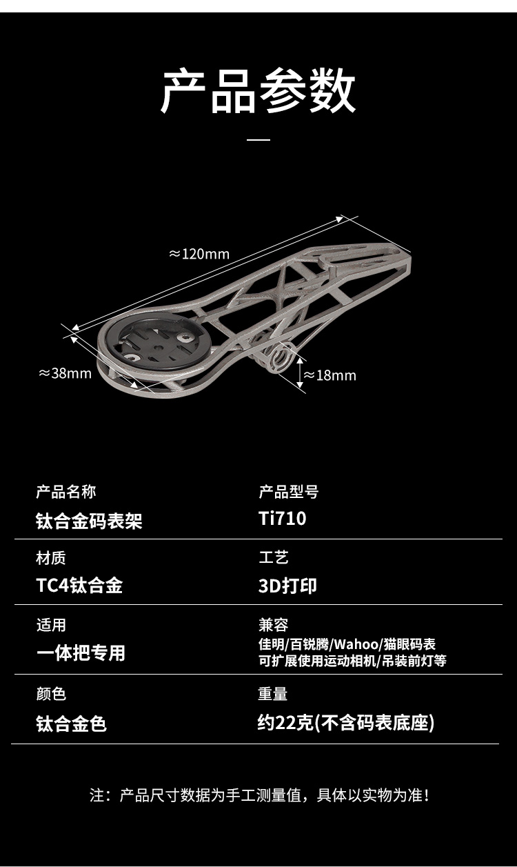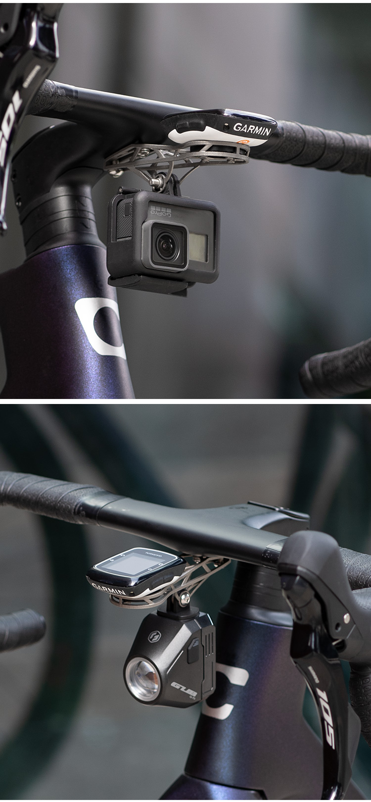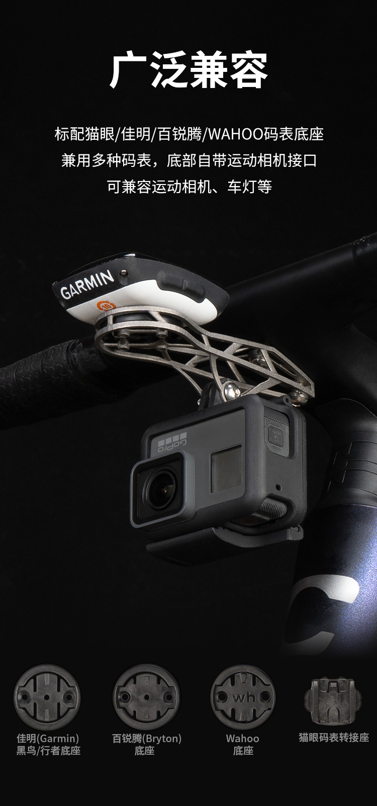 特點:鈦合金超輕架體,3D打印工藝,居中安裝節(jié)省空間(一體把專用),兼容多種碼表,標(biāo)配運動相機轉(zhuǎn)接座,可擴展使用運動相機等配件