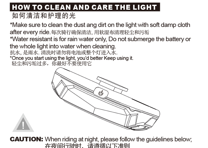 特性:LED技術(shù),COB整面發(fā)光30顆燈珠,高亮100流明設(shè)計(jì);配備USB接口,可循環(huán)充電;六種模式可循環(huán)切換;電池自動(dòng)保護(hù)功能,電壓低于2.8V不工作;硅膠捆扎固定方式,120度方位調(diào)整,方便拆卸安裝;方型背扣設(shè)計(jì),可橫向和縱向不同角度安裝;可安裝在坐管,下叉,車把手,前叉等。