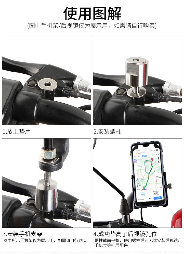 簡介:此配件為后視鏡輔助配件,采用不銹鋼材質(zhì),耐用不生銹,用于摩托車/電動車后視鏡孔位的擴(kuò)展,起到墊高或更好適配的作用。