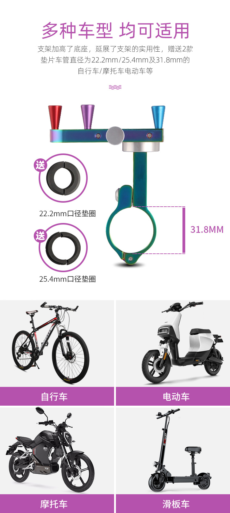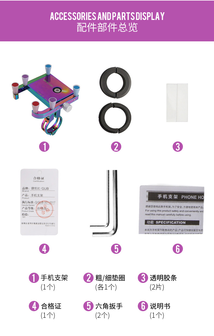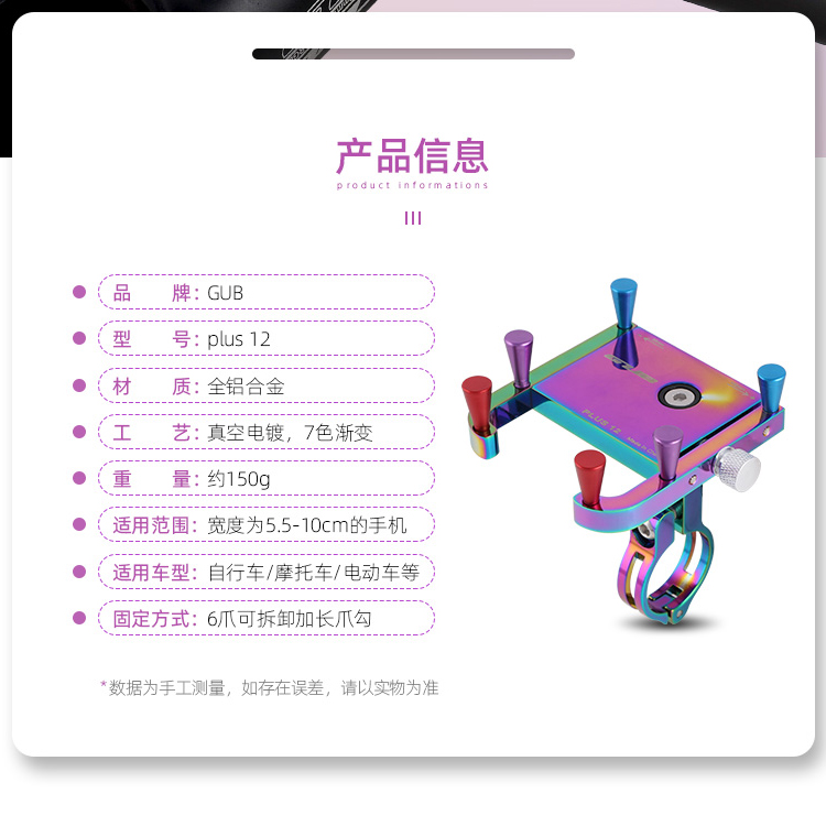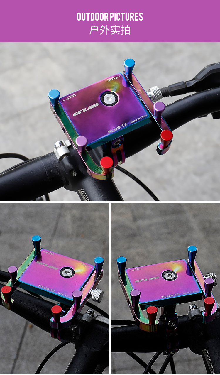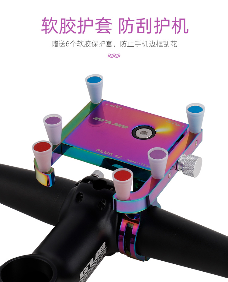 特點:鋁合金架體,表面七彩電鍍工藝,帶來猶如夢幻獨角獸般的觀感,高兼容性不挑手機(jī)型號,自行車、電動車等都可使用!