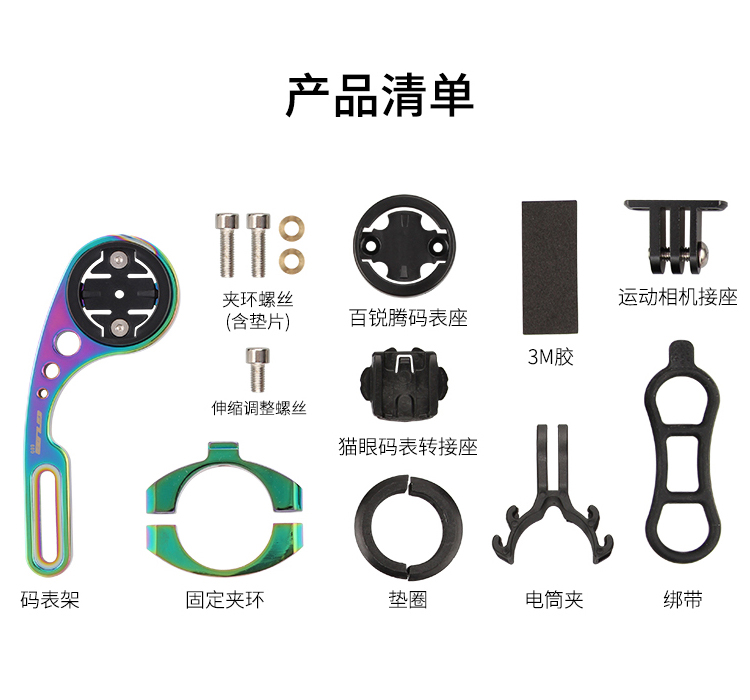 安裝在車把上,可伸縮設計,兼容佳明碼表,使用附帶的配件可兼容百銳騰碼表、貓眼碼表,另標配運動相機轉(zhuǎn)接頭和電筒轉(zhuǎn)接頭。
