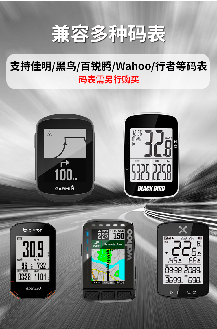 支持碼表:GARMIN全系列(兼用行者/黑鳥/iGPS等),貓眼全系列,百銳騰系列,wahoo系列