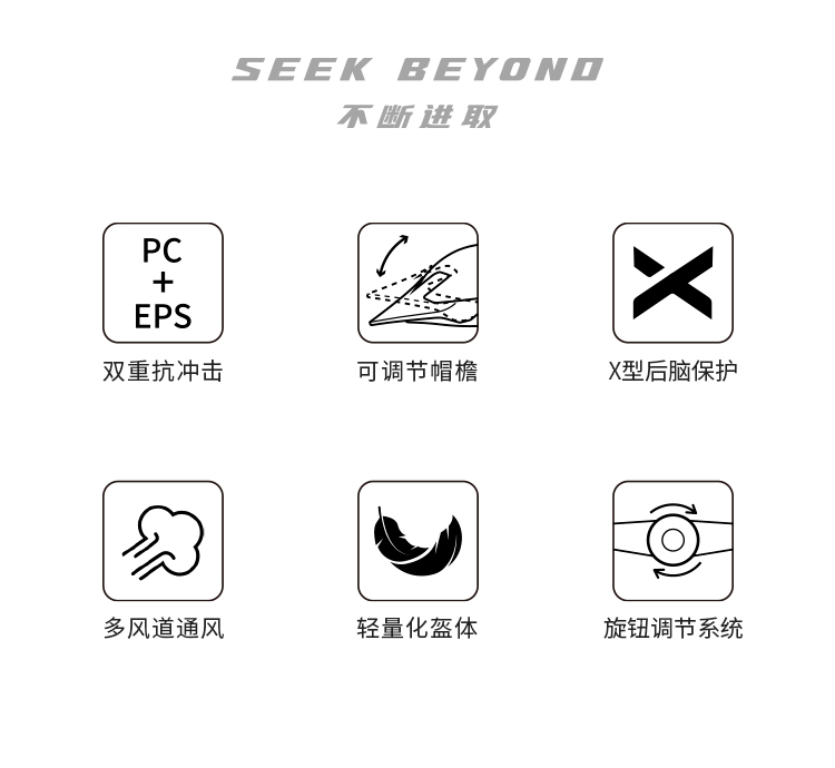 特點(diǎn):PC+EPS雙重防護(hù),輕量化盔體,多風(fēng)道透氣,可調(diào)節(jié)帽檐,X型后腦勺加強(qiáng)防護(hù)設(shè)計(jì)。