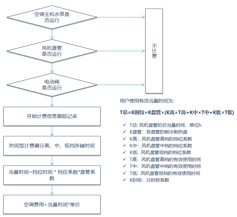 當(dāng)系統(tǒng)提供制冷或制熱的前提下,用戶電動閥門打開,用戶的風(fēng)機盤管有效運行,系統(tǒng)開始監(jiān)控計費。