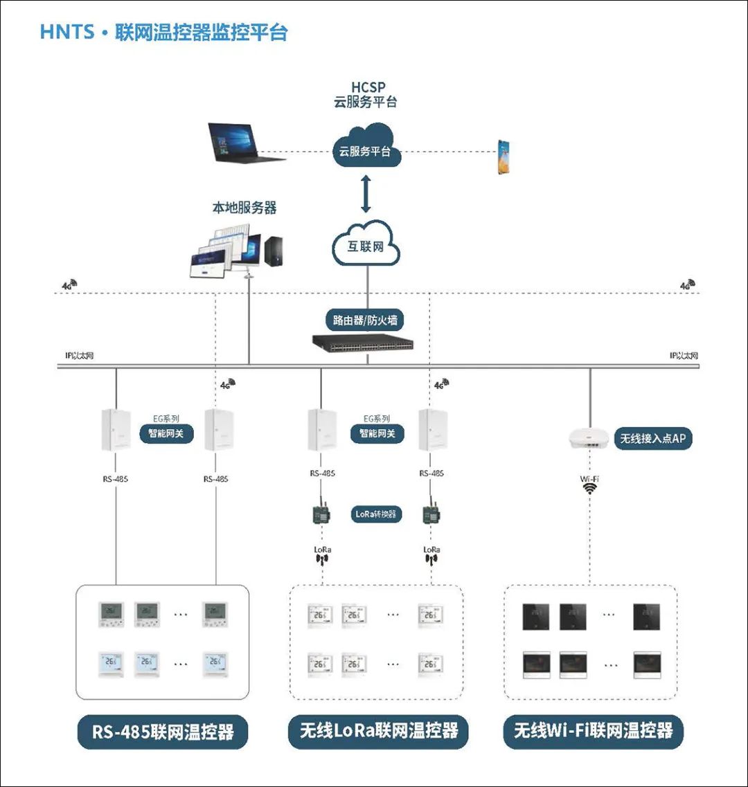 海林HNTS末端溫控器集控系統(tǒng)集自動化控制技術(shù)、計算機(jī)網(wǎng)絡(luò)技術(shù)于一體,可同時集中或獨立對多臺末端設(shè)備的啟停、水閥的開閉及溫度設(shè)置進(jìn)行控制。有三種聯(lián)網(wǎng)集控方式:RS-485 有線方式、 LoRa 無線方式和 Wi-Fi 無線方式。