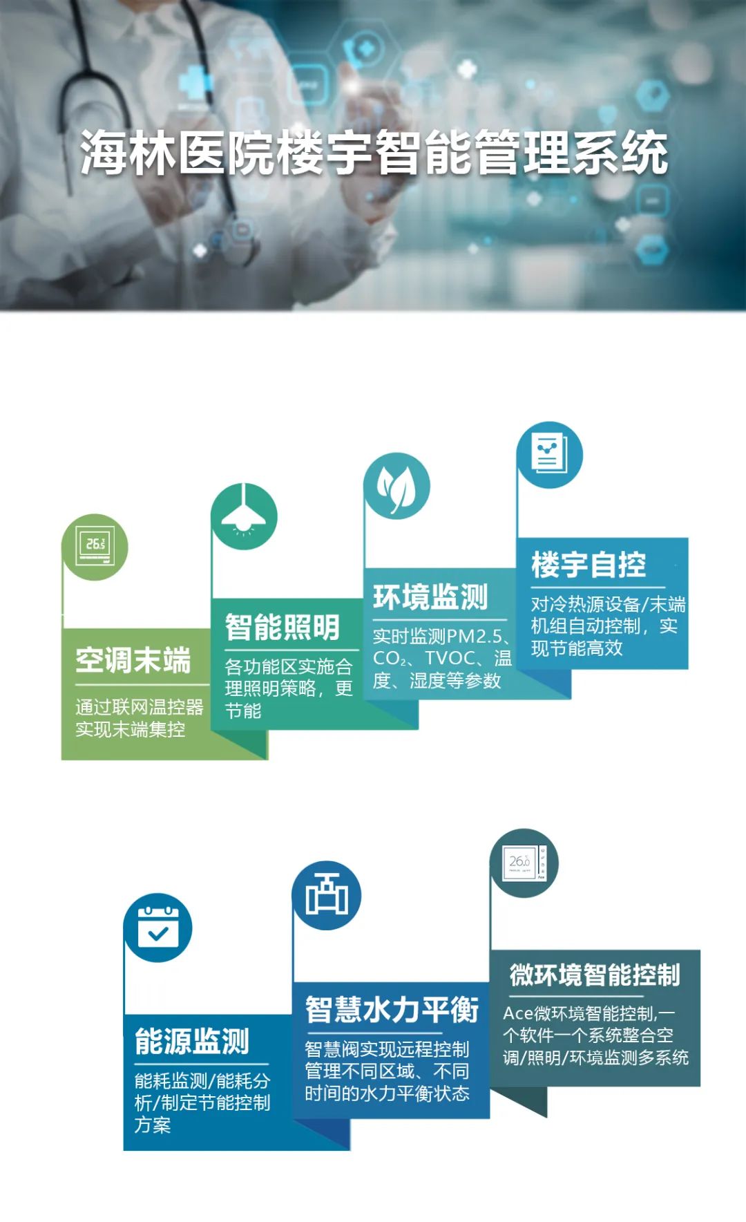 江蘇海林針對于現(xiàn)代醫(yī)院設(shè)計了樓宇智能管理系統(tǒng),集能耗分析和平臺集控于一體,將空調(diào)末端、智能照明、環(huán)境監(jiān)測、微環(huán)境管理、樓宇自控、能源管理、智慧水力平衡等系統(tǒng)集成到一個平臺,各子系統(tǒng)之間實現(xiàn)互聯(lián)互通,聯(lián)動控制。