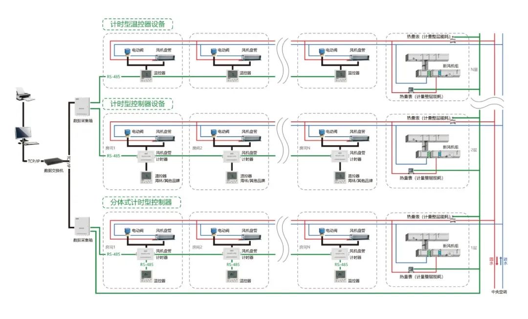 海林HNTS末端溫控器集控系統(tǒng)集自動(dòng)化控制技術(shù)、計(jì)算機(jī)網(wǎng)絡(luò)技術(shù)于一體,可同時(shí)集中或獨(dú)立對(duì)多臺(tái)末端設(shè)備的啟停、水閥的開(kāi)閉及溫度設(shè)置進(jìn)行控制。有三種聯(lián)網(wǎng)集控方式:RS-485 有線方式、 LoRa 無(wú)線方式和 Wi-Fi 無(wú)線方式。