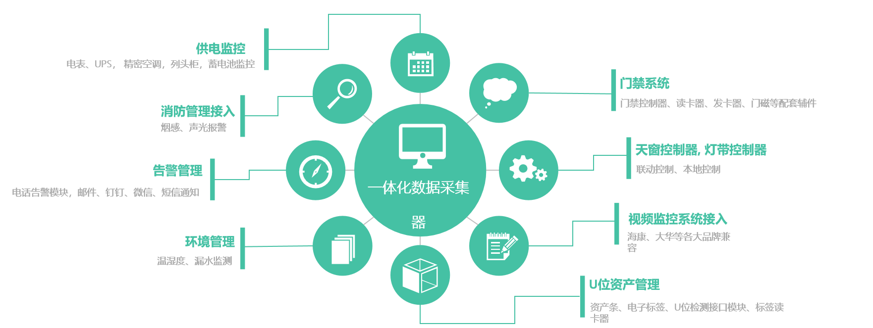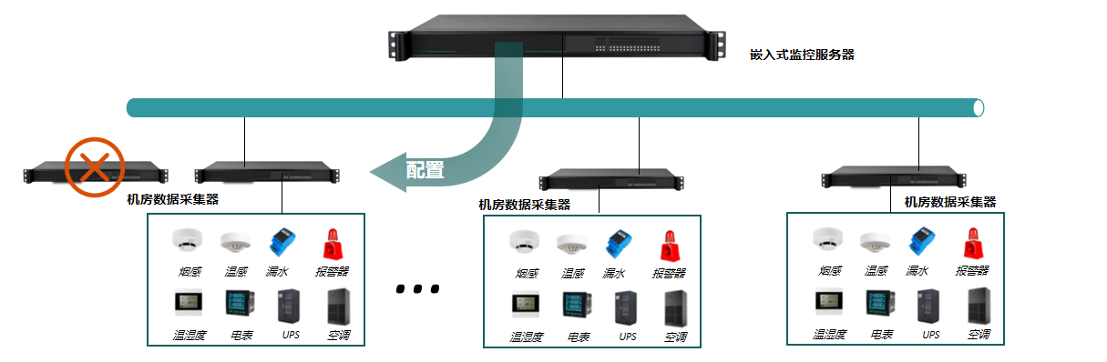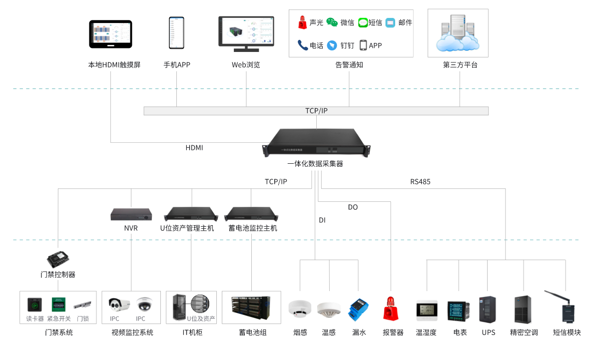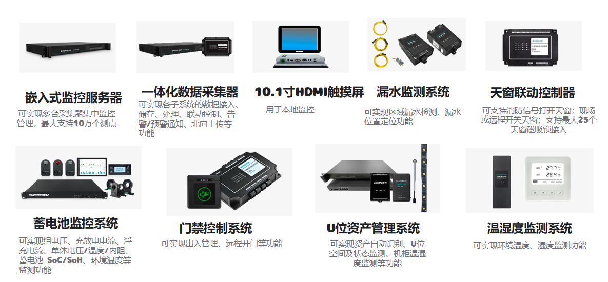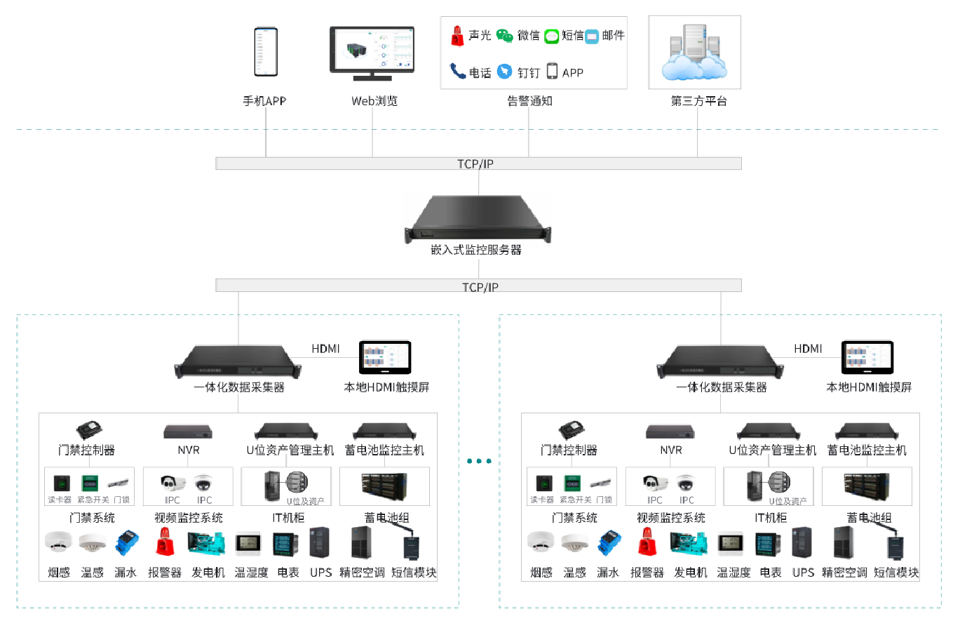 該系統由:嵌入式監(jiān)控服務器、一體化數據采集器、HDM觸摸屏、漏水監(jiān)測系統、天窗聯動控制器、蓄電池監(jiān)控系統、門禁控制系統、U位資產管理系統、溫濕度監(jiān)控系統組成