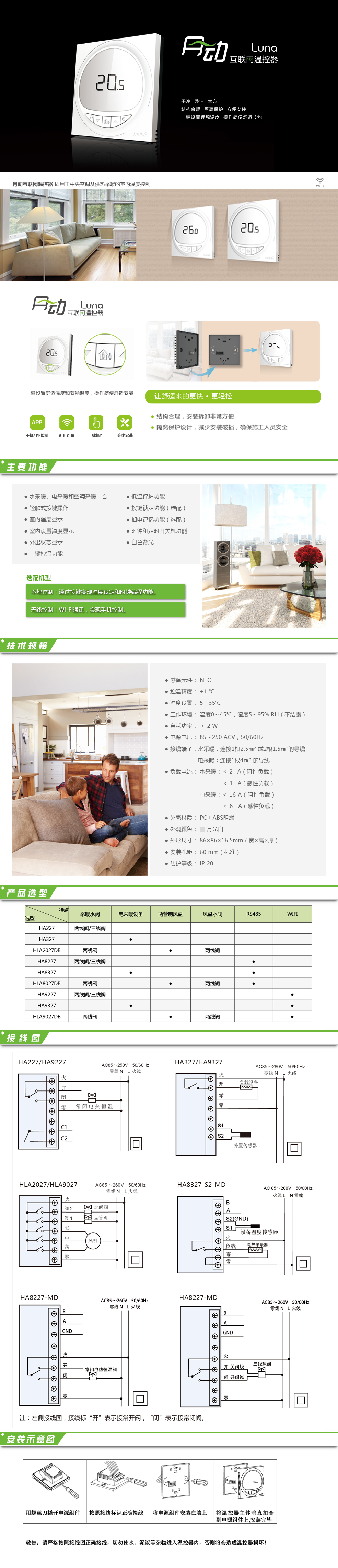 月動采暖溫控器包括“本地控制、有線控制、無線控制”三種類型,適用于家庭地板采暖系統(tǒng)或散熱器采暖系統(tǒng)的室內(nèi)溫度控制。外觀干凈整潔大方,結(jié)構(gòu)合理極易拆裝。人性化隔離保護設(shè)計防止安裝破損,保證施工人員安全。采暖型產(chǎn)品一鍵設(shè)置舒適溫度和節(jié)能溫度,極大方便用戶的操作使用。