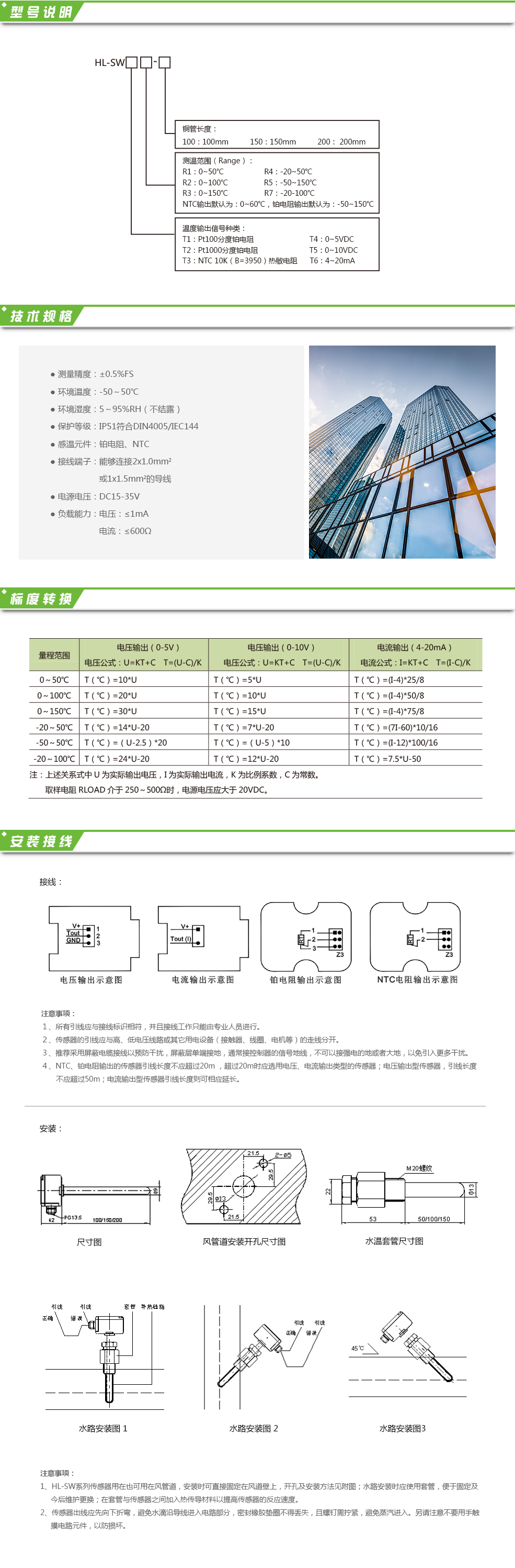 HL-SW系列溫度傳感器廣泛應(yīng)用于樓宇自動(dòng)領(lǐng)域,主要用于水管道、風(fēng)管道的溫度測(cè)量,可提供多種溫度測(cè)量范圍,以適應(yīng)管道流體介質(zhì)的不同;可提供NTC、鉑電阻、電壓、電流信號(hào)輸出,可以適應(yīng)各種控制系統(tǒng)的不同要求。